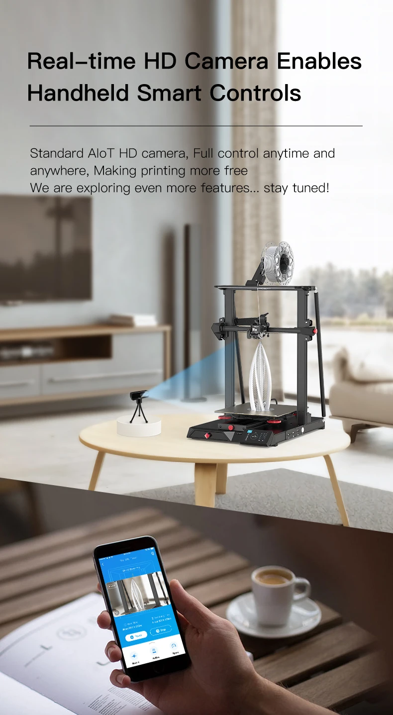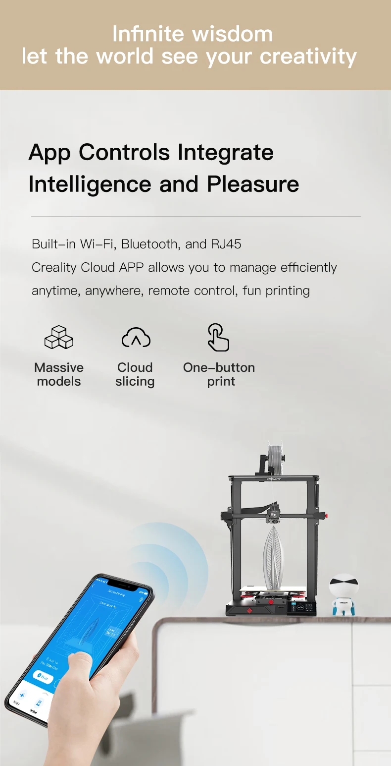 Imprimanta CR10 Smart 3D are și un modul WI-FI și vă permite să vă conectați la computer și telefon.
